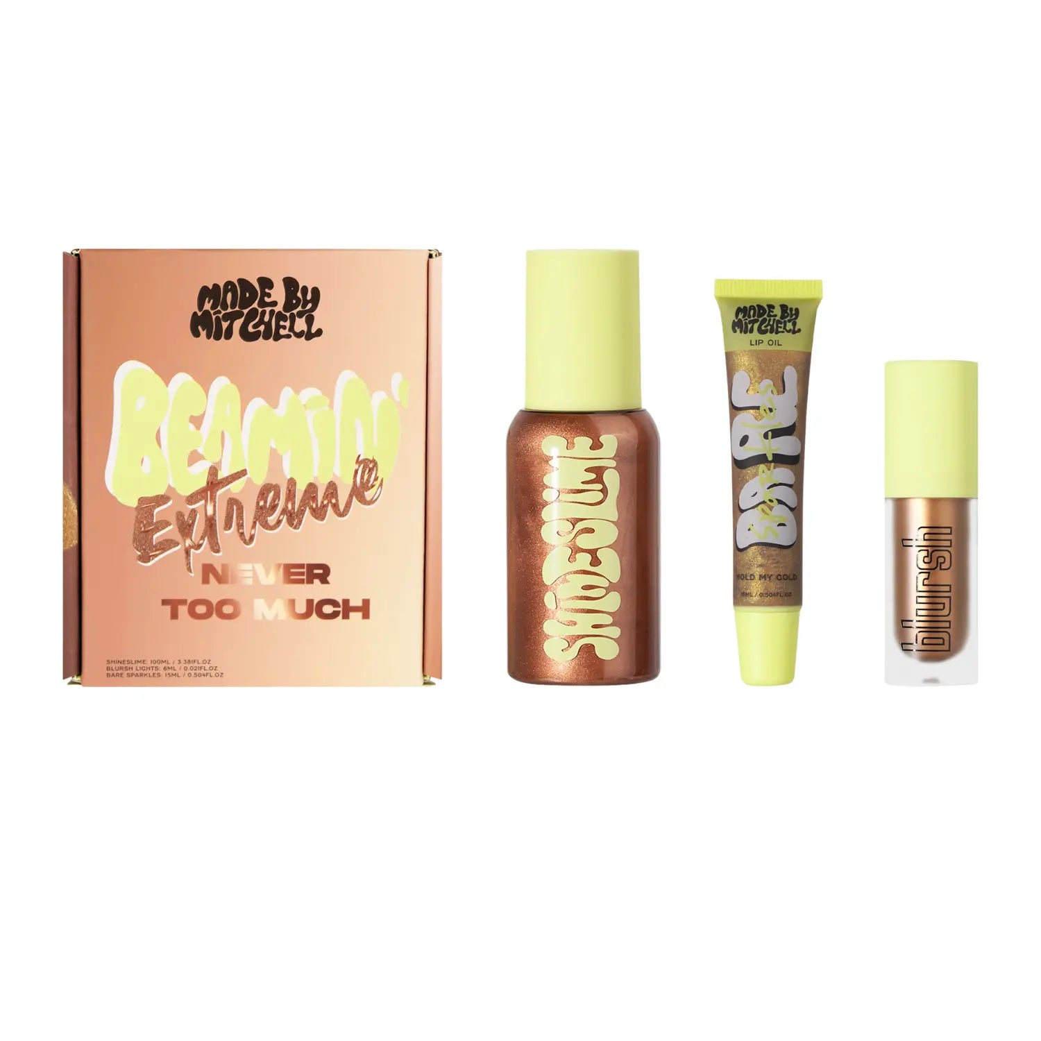 Le Made By Mitchell Beamin Extreme Never Too Much Bundle est tout ce qu’il vous faut pour briller de la tête aux pieds. Ce trio de rêve est rempli de glow, paillettes et éclat: croyez-nous, vous allez faire sensation. Que vous souhaitiez une touche subtile ou un look ultra glitter, ce set vous permet de rayonner à votre manière. Ce beauty bundle est disponible en plusieurs teintes : choisissez celle qui vous correspond parfaitement !