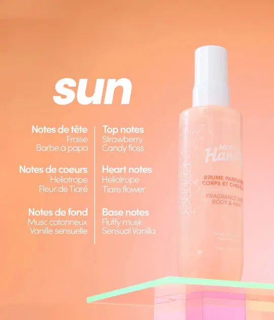 Le Merci Handy Body And Hair Mist Sun est enfin arrivé: et crois-nous, l’attente en valait la peine ! Ce mist d’été est ton nouveau must-have pour une dose instantanée de bonheur. On y a mis les plus beaux rayons du soleil, une touche de vacances et un soupçon de poussière d’étoile, le tout dans un flacon rempli de good vibes.