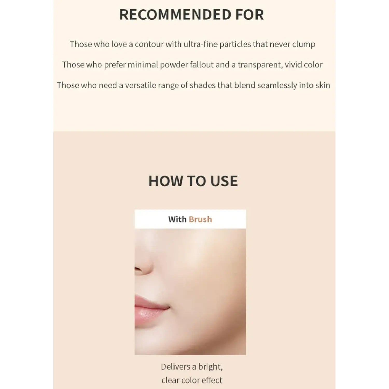 La technologie Silky Elastic Powder assure une finition longue tenue et sans effet gras, qui reste impeccable toute la journée. Que tu préfères un contour discret ou un look plus prononcé, cette poudre est modulable et s’adapte joliment à ta carnation. Parfait pour celles et ceux qui aiment un contour clean, frais et sans effort !