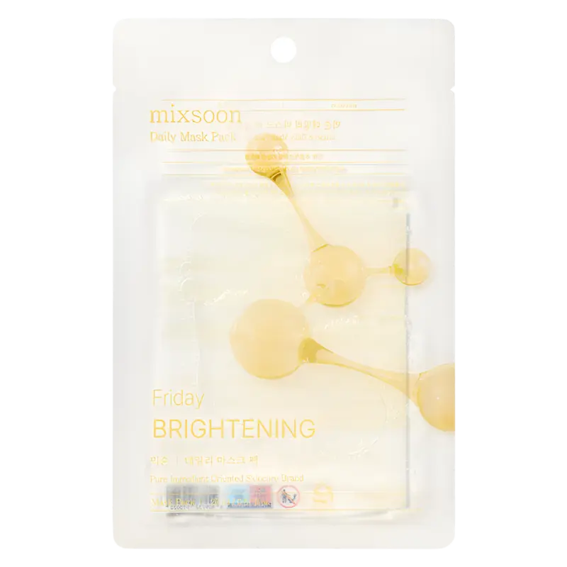 Le Mixsoon Daily Mask Pack Friday Brightening est le masque en tissu parfait pour bien commencer ton week-end avec une peau éclatante ! Ce masque ultra-fin de 0,2 mm en cellulose végétale épouse parfaitement la peau, permettant à l’essence enrichie en niacinamide et alpha-arbutine de pénétrer profondément et d’unifier visiblement le teint. Idéal pour les peaux ternes ou fatiguées qui ont besoin d’un coup d’éclat !