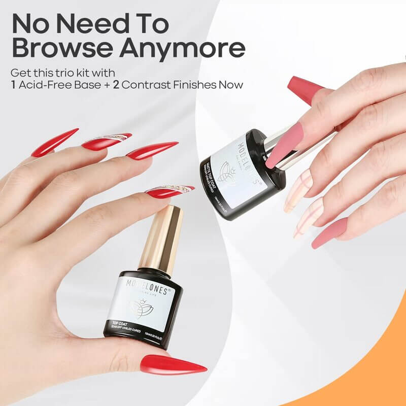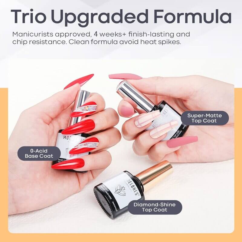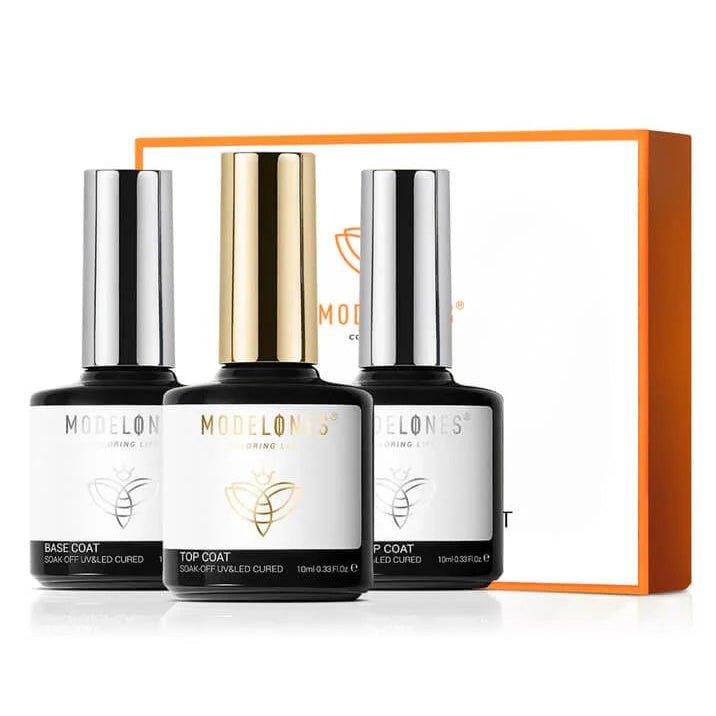 La formule améliorée assure une excellente adhérence, sans écailles, bavures ni décollement. Le base coat offre une base solide, le top coat brillant donne un éclat intense. Tu préfères quelque chose de plus doux ? Le top coat mat offre un fini velouté. Et le meilleur ? Ce set est compatible avec toutes les marques de vernis gel: même si le meilleur résultat est obtenu avec les couleurs gel de Modelones.