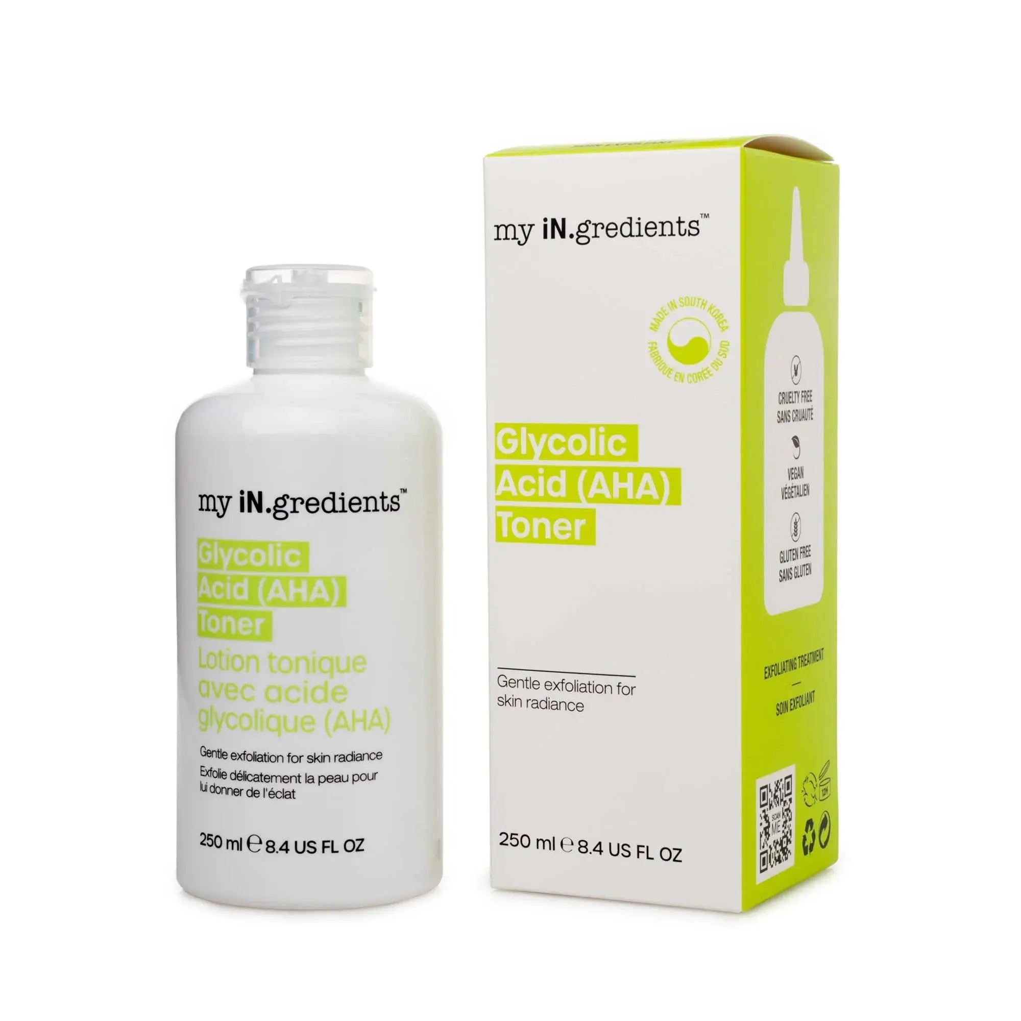 La My In.gredients Toner Glycolic Acid est un indispensable pour une peau éclatante et uniforme ! Ce toner exfolie la peau en douceur, éliminant les cellules mortes et affinant la texture de la peau. Avec 7 % d’Acide Glycolique (AHA) actif, cette formule aide à traiter les dommages visibles causés par le soleil, les pores obstrués et les irrégularités de texture.