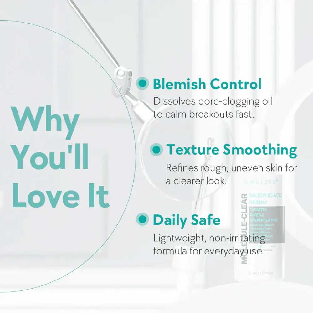 Le Nine Less Molecule-Clear Salicylic Acid Serum est votre nouvel indispensable si vous avez la peau brillante, des points noirs ou des imperfections. Avec 1 % d’acide salicylique (BHA), ce sérum exfolie les pores en profondeur, traite efficacement les imperfections et aide à prévenir les obstructions futures. En même temps, sa formule maintient l’équilibre de la peau grâce à des ingrédients hydratants et apaisants. Pas de tiraillements, juste un éclat sain !
