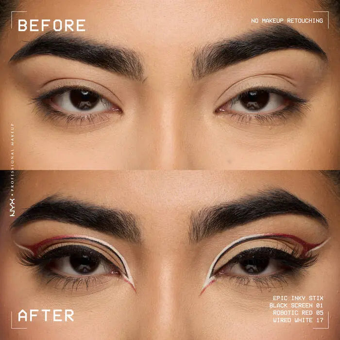 Le NYX Professional Makeup Epic Inky Stix Eyeliner Black Screen est ton eyeliner noir ultime pour un look noir mat intense qui tient toute la journée. Ce crayon gel crémeux glisse facilement sur la peau et offre une pigmentation intense en un seul geste: sans tiraillement, bavure ni débordement.