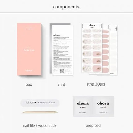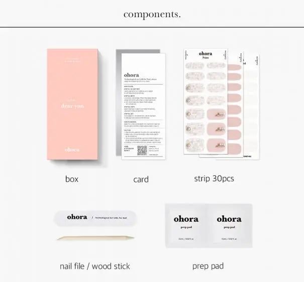 Contenu : 30 bandes à ongles de 15 tailles différentes, 2 lingettes de préparation, 1 lime à ongles, 1 stick manucure.