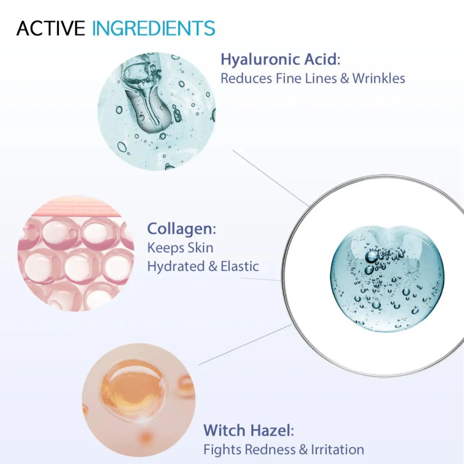 Water, Glycerin, Methylpropanediol, 1,2-Hexanediol, Butylene Glycol, Carbomer, Tromethamine, Ethylhexylglycerin, Propanediol, Polyglyceryl-10 Laurate, Allantoin, Fragrance, Hamamelis Virginiana (Witch Hazel) Leaf Extract, Hydrolyzed Collagen, Soluble Collagen, Sodium Hyaluronate, Atelocollagen