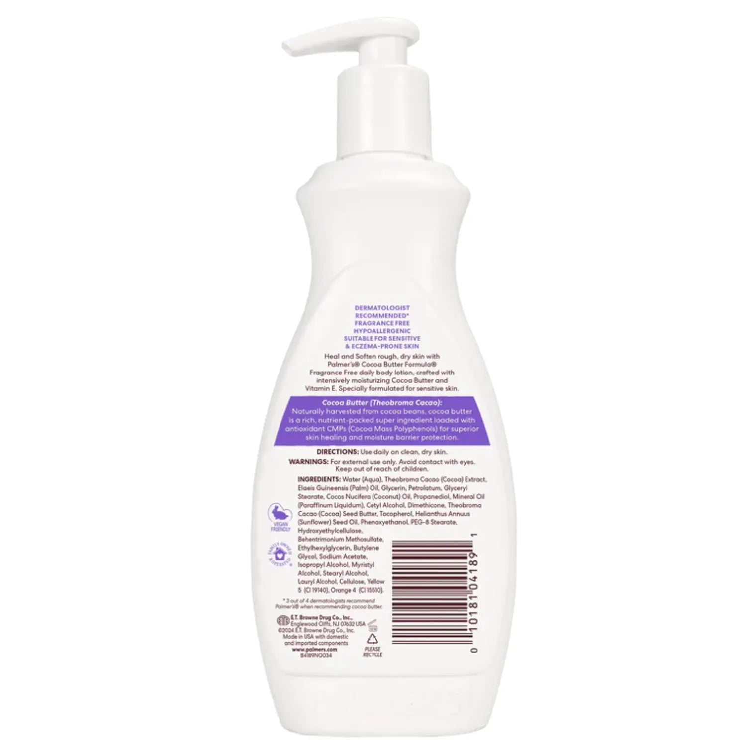La Palmer's Cocoa Butter Formula Lotion Fragrance Free 400 ml est la lotion corporelle idéale pour les peaux sensibles qui ont besoin de soins intensifs, sans fioritures. Cette version sans parfum a été spécialement formulée pour apaiser les peaux rugueuses et sèches et les hydrater en profondeur : parfaite pour les peaux réactives ou si tu préfères éviter les parfums.