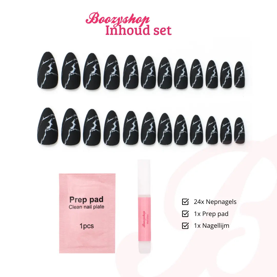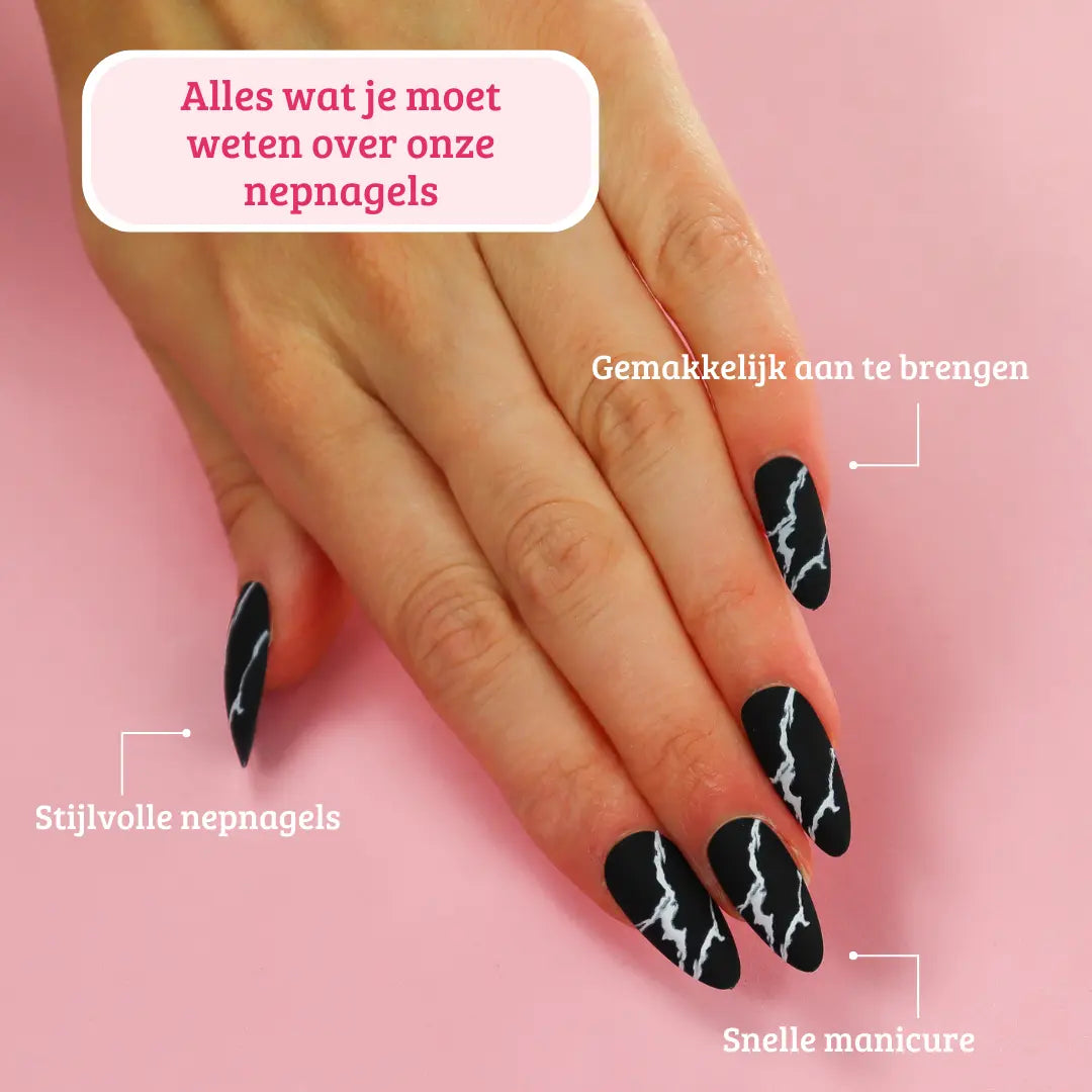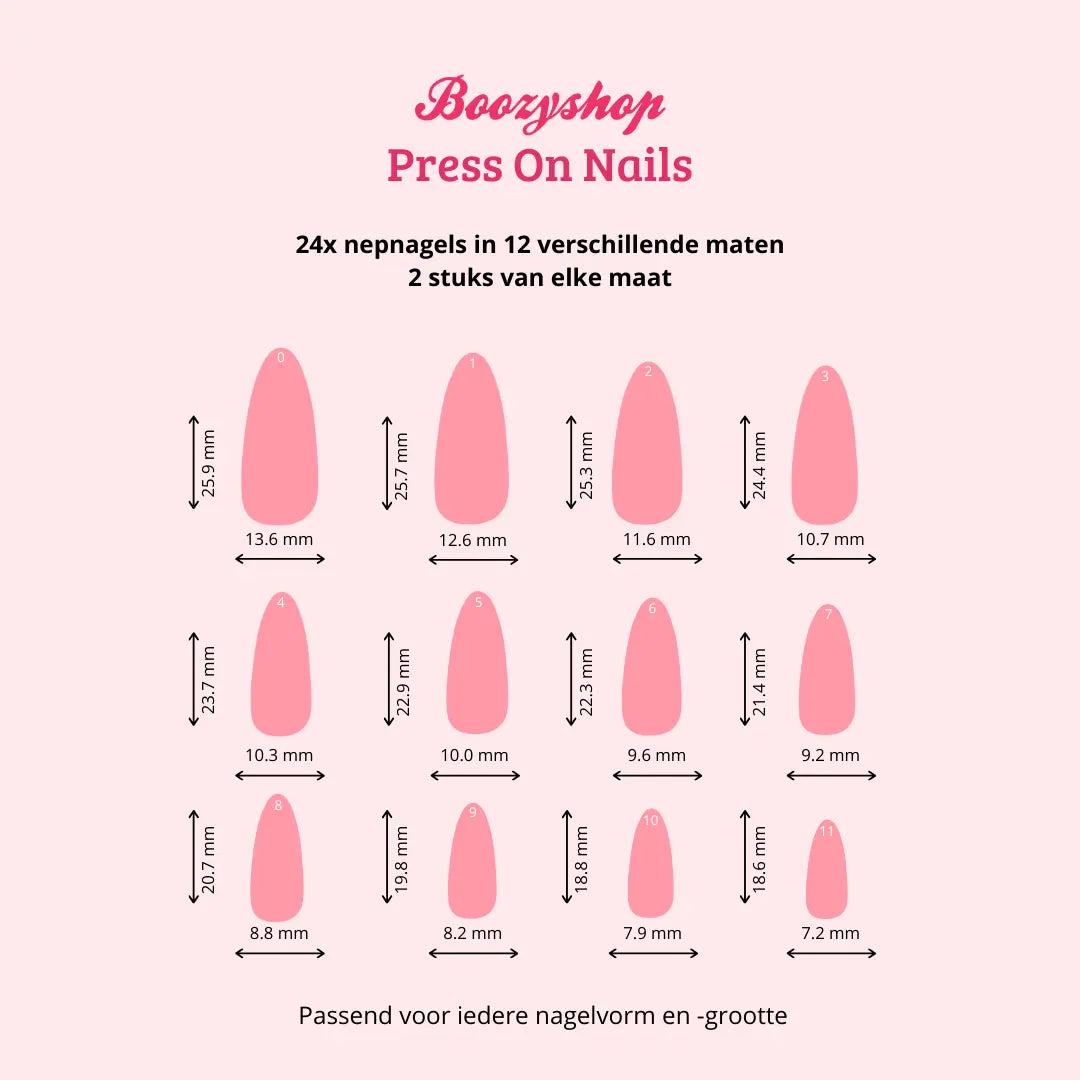 Les Boozyshop Press On French Nails Black Marble sont la solution parfaite pour de beaux ongles en un instant. Ces ongles artificiels sont non seulement élégants, mais ont également un effet marbré qui donne à vos ongles un look chic. Offrez-vous une manucure rapide avec ce lot de presse-ongles, composé de 24 pièces de 12 tailles différentes. Chaque clou est numéroté de 0 à 11, ce qui facilite le choix de la taille la plus adaptée. Cet ensemble contient également de la colle à ongles et un tampon de préparation pour préparer de manière optimale vos ongles pour une adhérence à long terme.