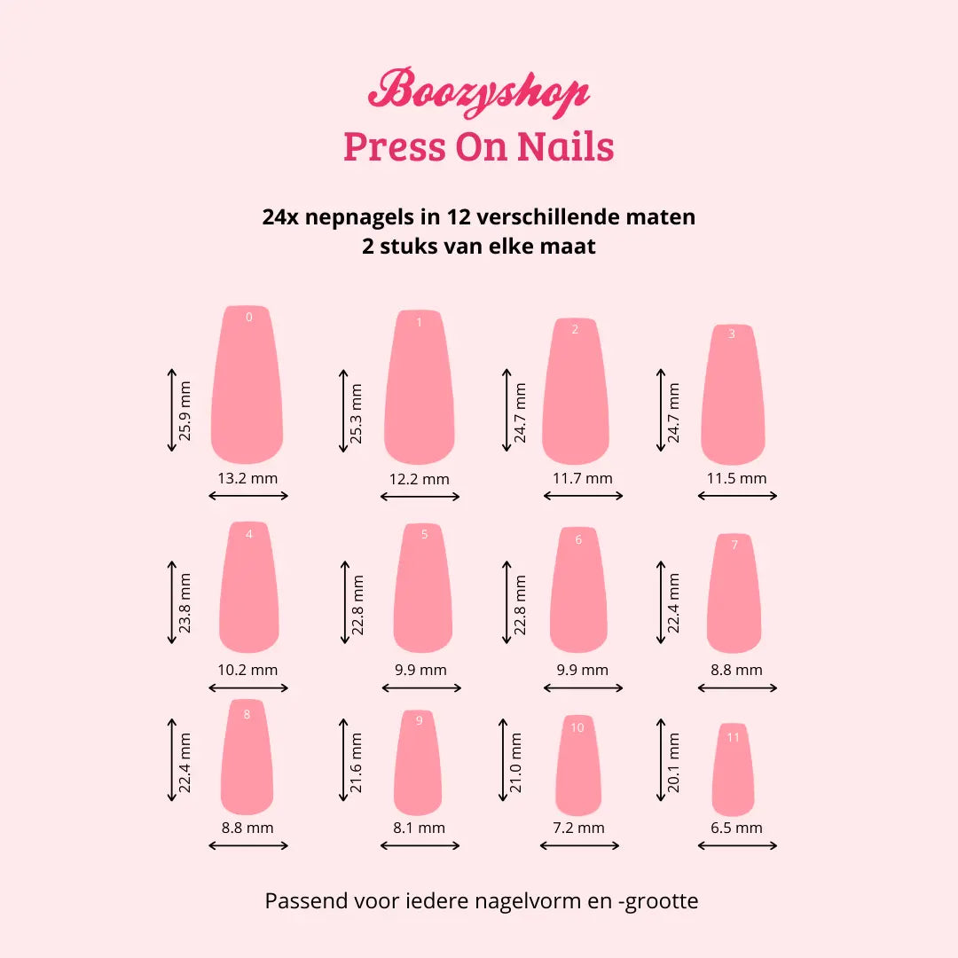 Ce set contient 24 faux ongles en 12 tailles différentes, pour une tenue parfaitement ajustée à chaque ongle. Chaque ongle est numéroté de 0 à 11 – pratique pour repérer rapidement la bonne taille. Vous trouverez aussi tout le nécessaire : une colle à ongles et un pad de préparation pour garantir une tenue impeccable et durable.