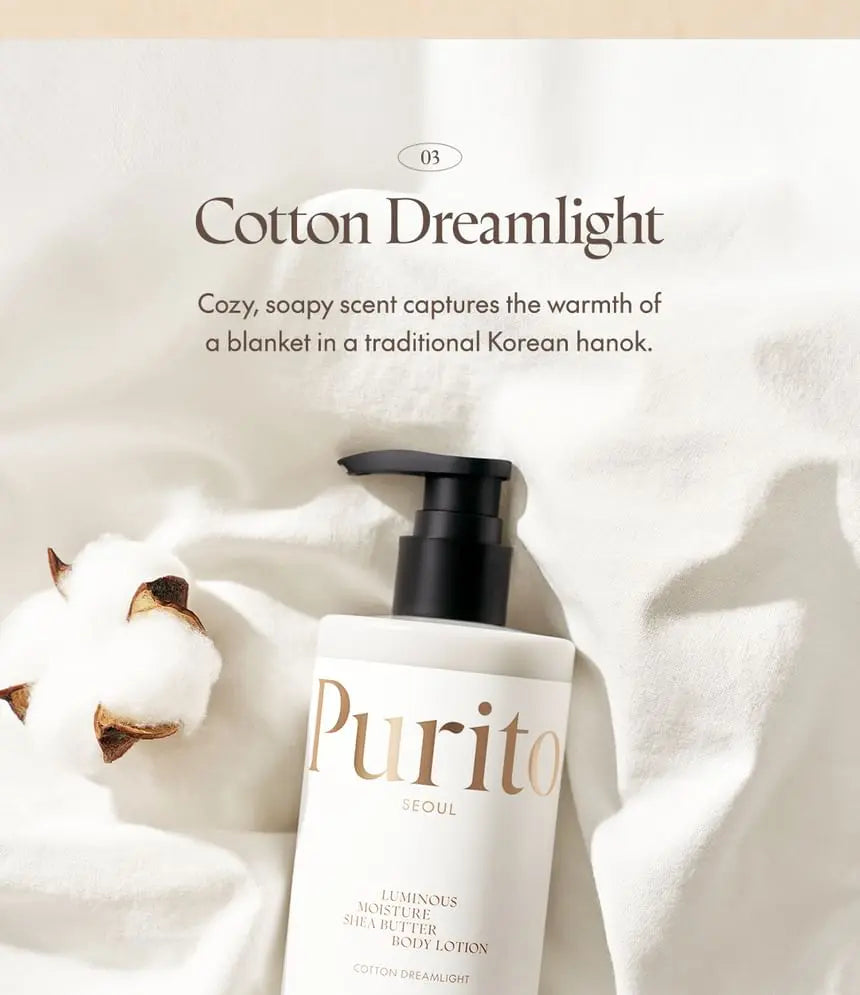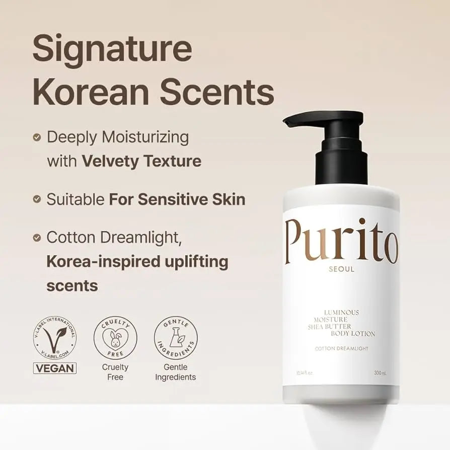La Purito Luminous Moisture Shea Butter Body Lotion Cotton Dreamlight est un vrai moment de plaisir pour la peau et les sens ! Cette lotion corporelle soyeuse est enrichie en beurre de karité nourrissant, en extrait de fleur étoilée de Jeju et en huile de graines de camélia, une combinaison puissante pour hydrater intensément la peau et la rendre douce au toucher.