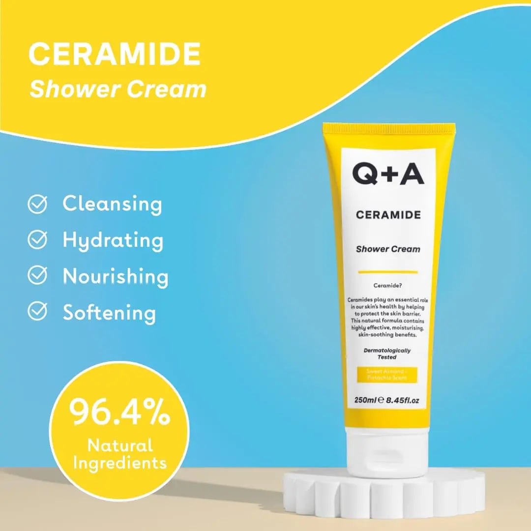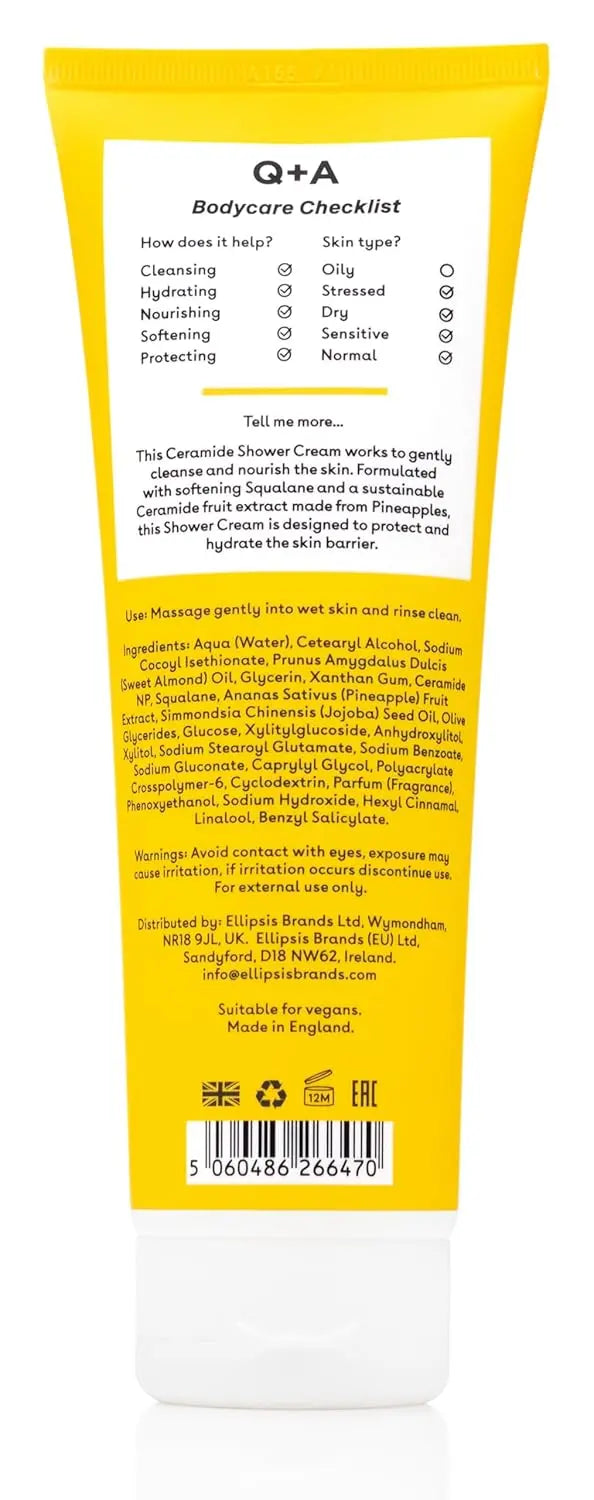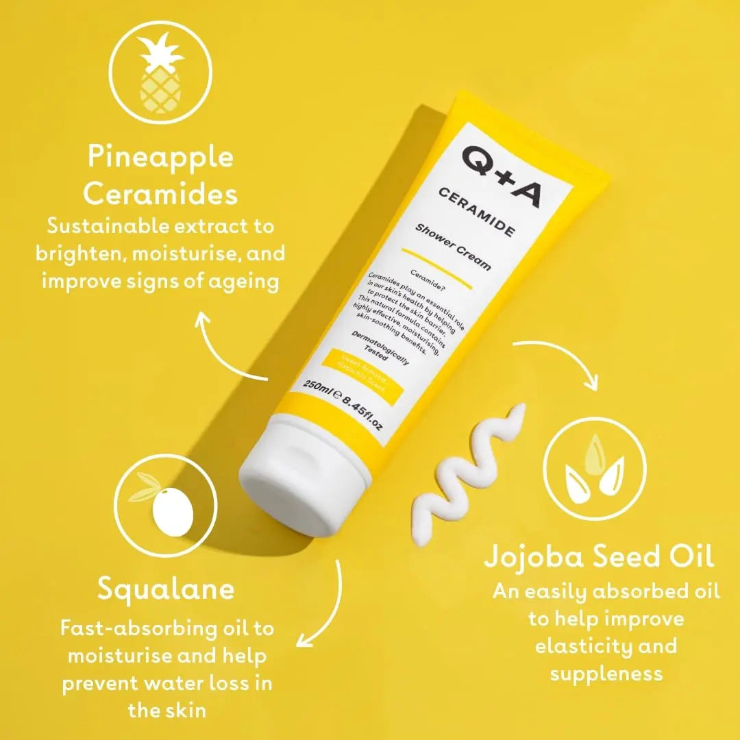 La Q+A Ceramide Shower Cream est ton nouveau favori pour une expérience de douche nourrissante et luxueuse. Cette crème de douche douce et onctueuse nettoie délicatement la peau avec une mousse légère, tandis que des ingrédients puissants comme le squalane, l’huile de jojoba et les céramides d’ananas prennent soin de ta peau en profondeur.