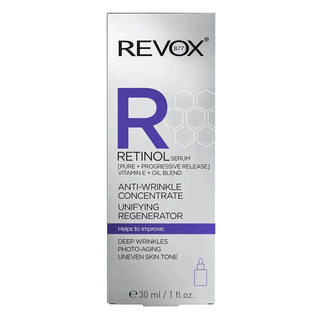 Le Revox Retinol Serum Unifying Regenerator est un sérum ultra-léger spécialement formulé pour réduire les signes de l'âge tels que les ridules, les rides et les taches brunes. Enrichi en vitamine A (rétinol), en vitamine E, en squalane et en huile d'avocat, ce sérum aide à garder votre peau éclatante et uniforme.