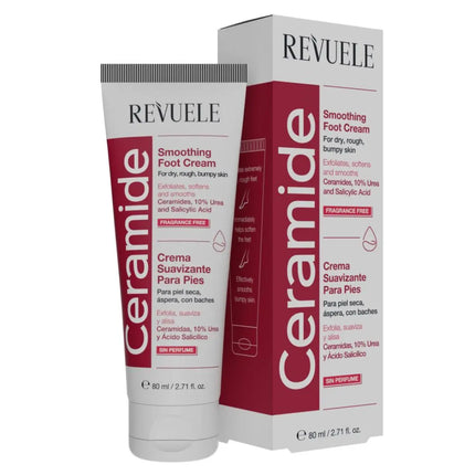 La Revuele Ceramide Smoothing Foot Cream procure une hydratation intensive et une récupération immédiate de la peau stressée et rugueuse de vos pieds. Enrichie en céramides essentiels, 10 % d'urée et d'acide salicylique, cette crème riche exfolie la peau, éliminant les zones sèches et laissant vos pieds plus lisses et plus doux.