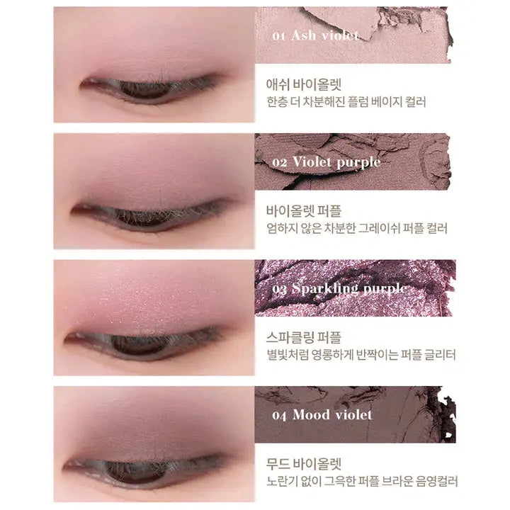 Mood Violet: Talc, Mica (CI 77019), Black Iron Oxide (CI 77499), Silica, Octyldodecyl Stearoyl Stearate, Phenyl Trimethicone, Red Iron Oxide (CI 77491), Manganese Violet (CI 77742), Ultramarine (CI 77007), Yellow Iron Oxide (CI 77492), Magnesium Myristate, Carmine (CI 75470), Dimethicone, Macadamia Integrifolia Seed Oil, Methylpropanediol, Magnesium Stearate, Propanediol, Triethoxycaprylylsilane, Dimethiconol Stearate, Lauroyl Lysine, Methicone, Purified Water, Titanium Dioxide (CI 77891), Helindone Pink CN (CI 73360).