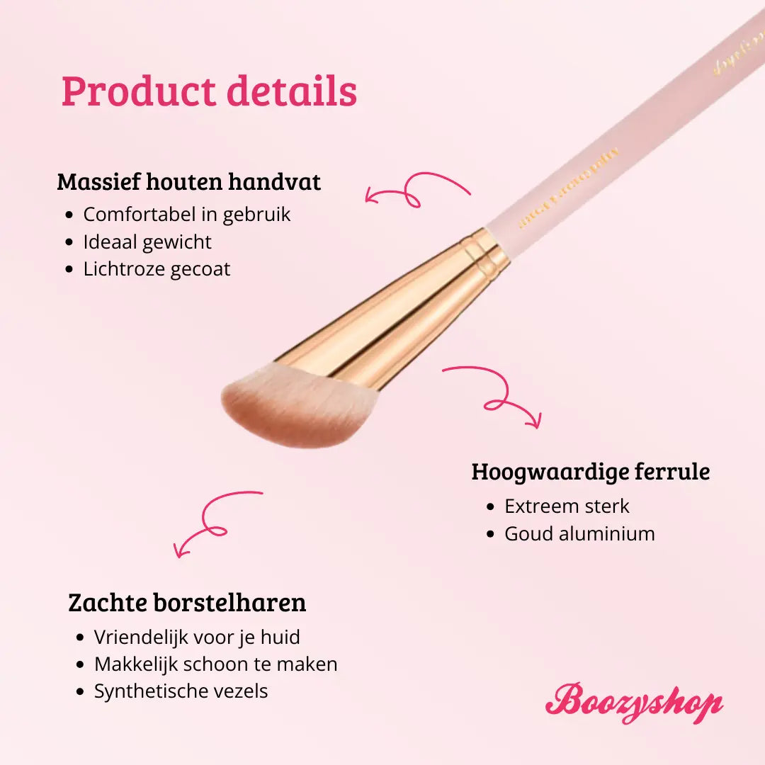 Le Boozyshop Soft Pink & Gold Angled Contour & Bronzer Brush est le pinceau de maquillage ultime pour appliquer et estomper uniformément votre contour et votre poudre bronzante. Vous pouvez appliquer des produits en poudre sans effort avec ce pinceau. Les cheveux coupés en diagonale suivent facilement les contours de votre visage, vous permettant de créer ce magnifique look ciselé.