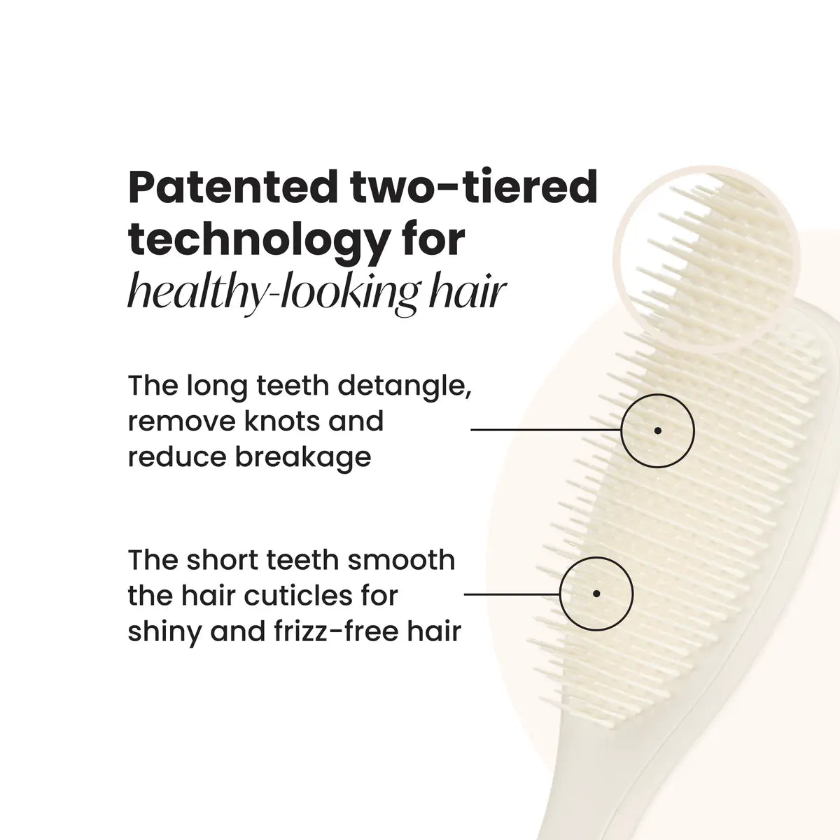 Grâce à la technologie brevetée à deux longueurs de dents, les nœuds sont éliminés sans effort tandis que les cheveux sont lissés en même temps. Les dents longues démêlent, les dents courtes apportent de la douceur. Parfaite pour répartir uniformément ton après-shampoing ou ton masque capillaire et offrir un soin boosté.