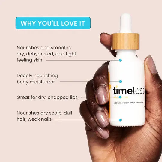 Le Timeless Skin Care Argan Oil 100% Pure est un véritable multitâche à toujours avoir sous la main. Cette huile 100 % naturelle et non raffinée du Maroc, aussi appelée "or liquide", est un sauveur pour la peau sèche, les cheveux ternes, les ongles cassants et même les lèvres gercées. Oui, tout cela dans un seul produit !