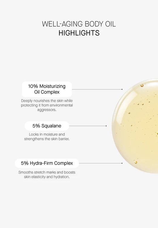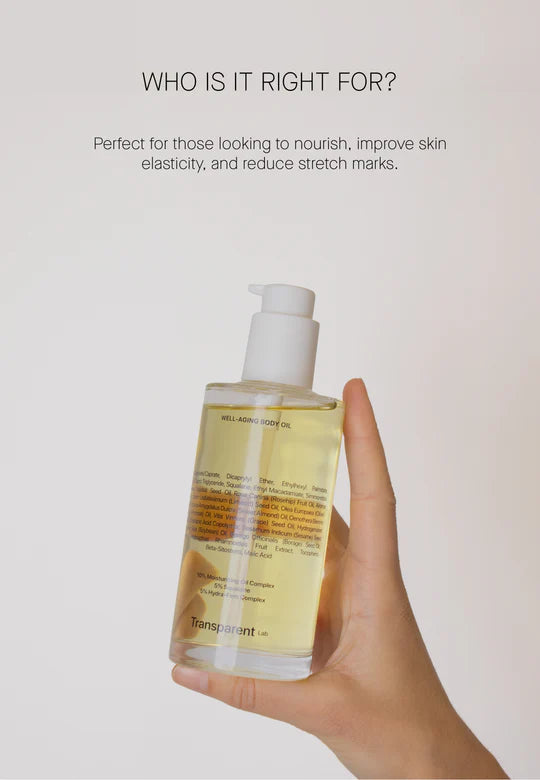 Le Transparent Lab Well-Aging Body Oil est ton nouveau favori skincare pour une peau soyeuse et éclatante de la tête aux pieds. Cette huile pour le corps luxueuse hydrate intensément, raffermit la peau et offre un glow naturel sans effet collant. Grâce à son absorption rapide, c’est l’huile corporelle idéale au quotidien, même quand tu es pressée.