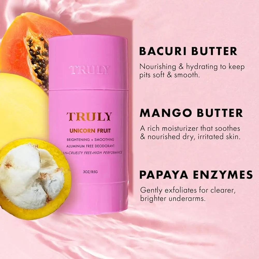 Le Truly Beauty Unicorn Fruit Skin Brightening And Smoothing Deodorant est un déodorant sans aluminium qui fait plus que simplement protéger contre les odeurs. Cette formule fraîche aide à éclaircir visiblement les aisselles foncées et rend la peau plus lisse et plus douce.