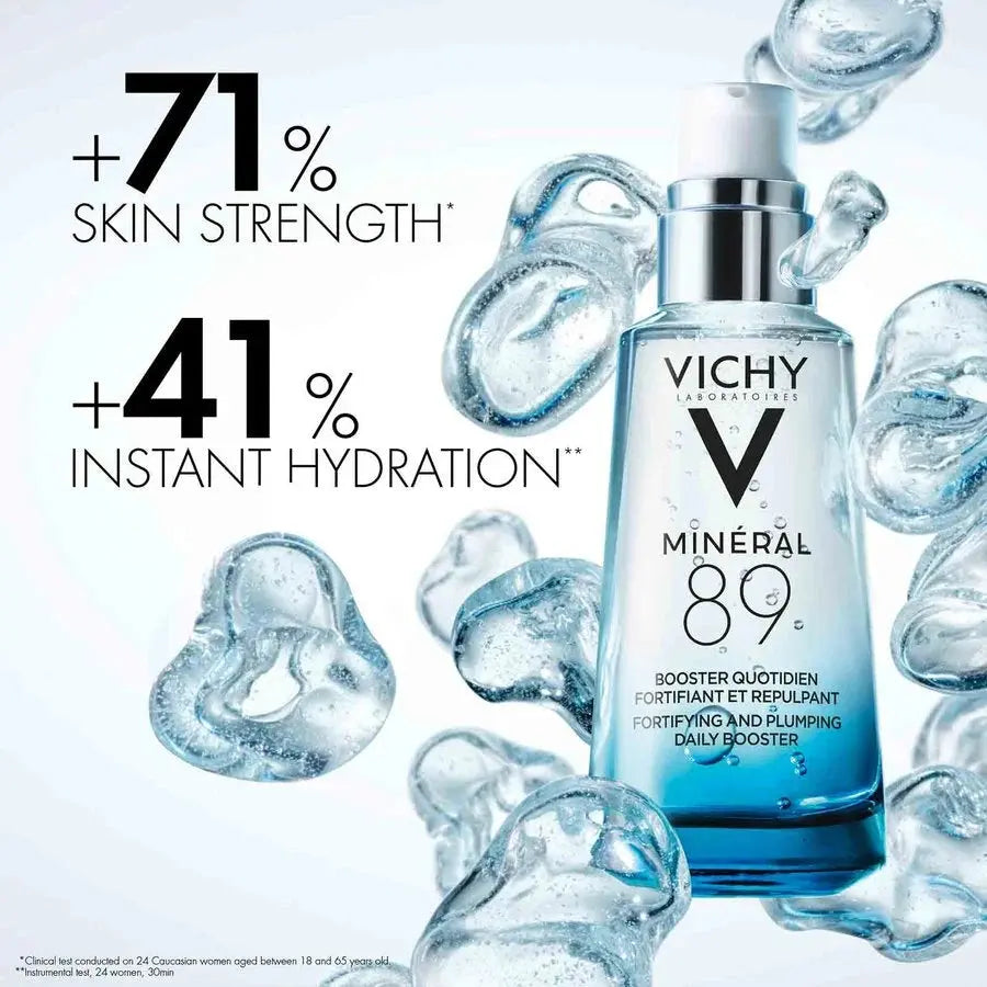 Le Vichy Mineral 89 Daily Booster Serum est un booster hydratant et fortifiant qui aide à renforcer et protéger la barrière cutanée. Sa formule innovante est enrichie de 89 % d’eau volcanique Vichy et d’acide hyaluronique pur ce qui offre un soin quotidien intensif laissant la peau plus rebondie et plus fraîche dès l’application.