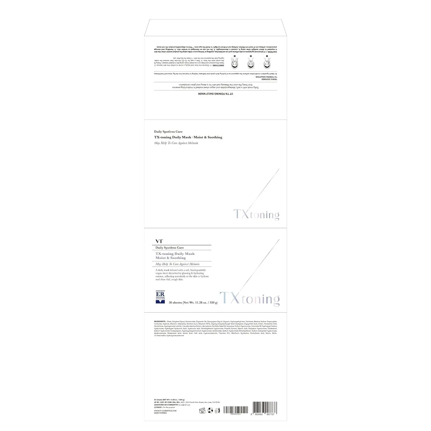 Le VT Cosmetics TX-Toning Daily Mask est ton moment spa quotidien en format boîte ! Ces masques en tissu ultra-hydratants sont infusés d’actifs puissants comme l’acide tranexamique, la niacinamide et le glutathion – les héros pour lutter contre les taches pigmentaires, le teint terne et la déshydratation. Parfaits pour celles et ceux qui rêvent du glow effet glass skin !